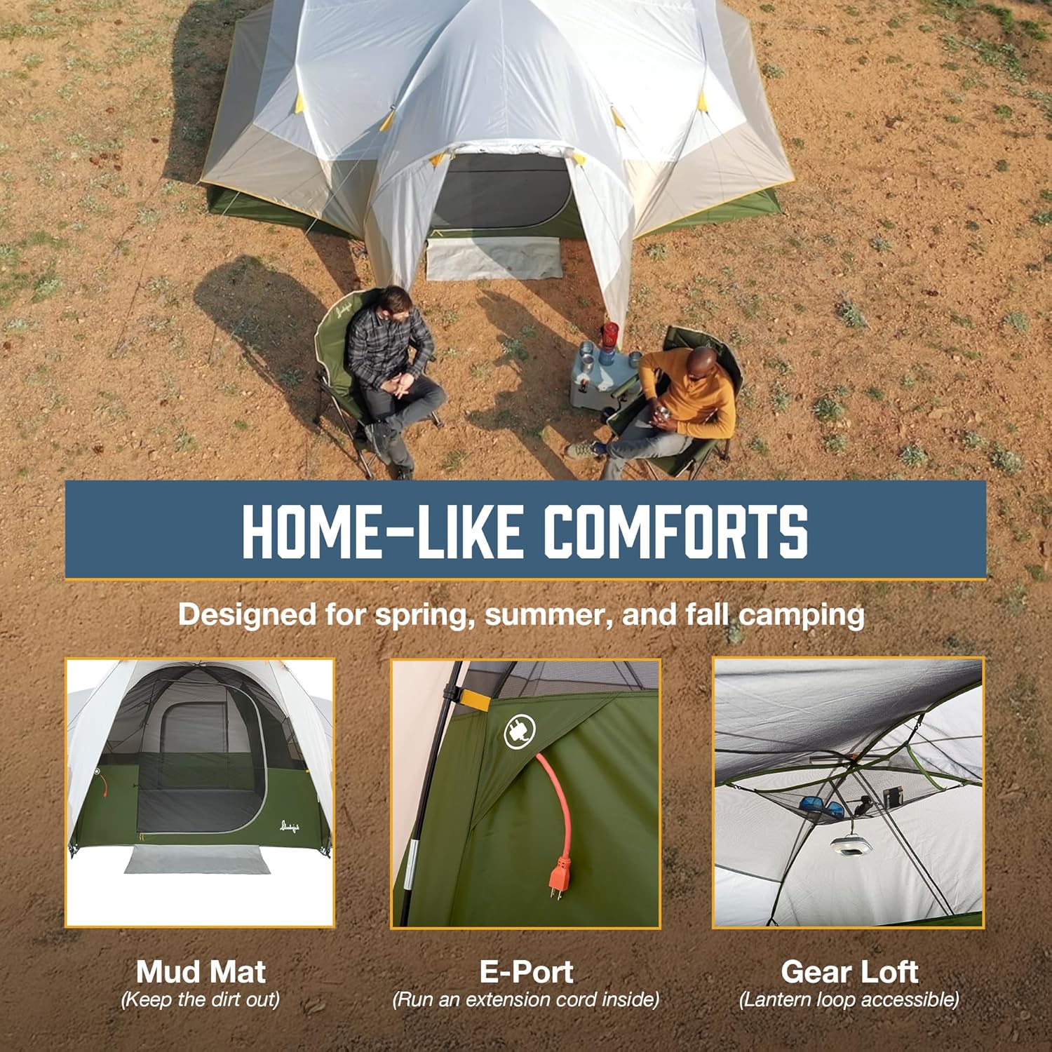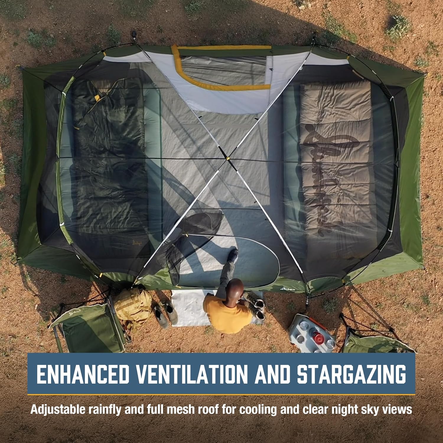 The tent features 2 separate rooms with a convenient room divider, providing privacy and organization for everyone in your group. With separate entries for each room, you can come and go as you please without disturbing your fellow campers.